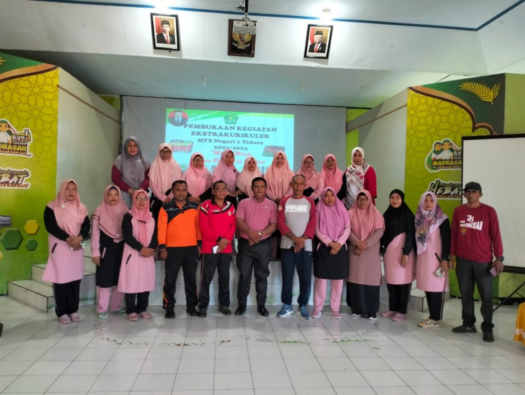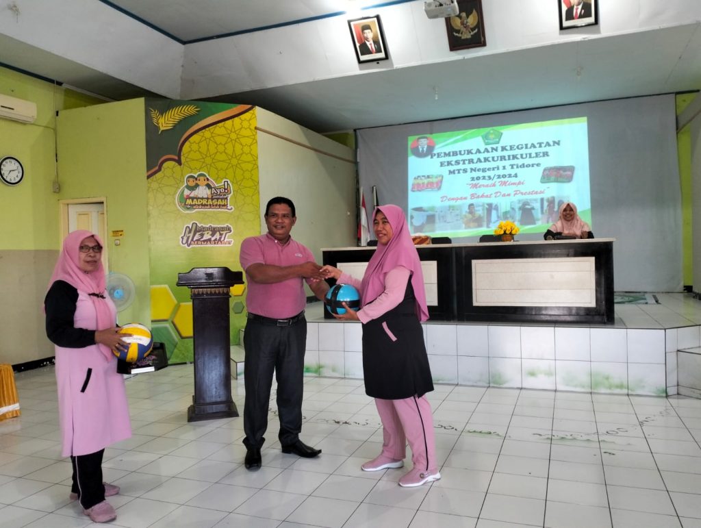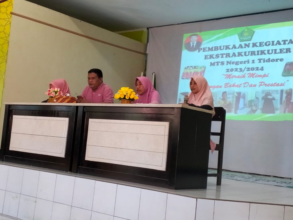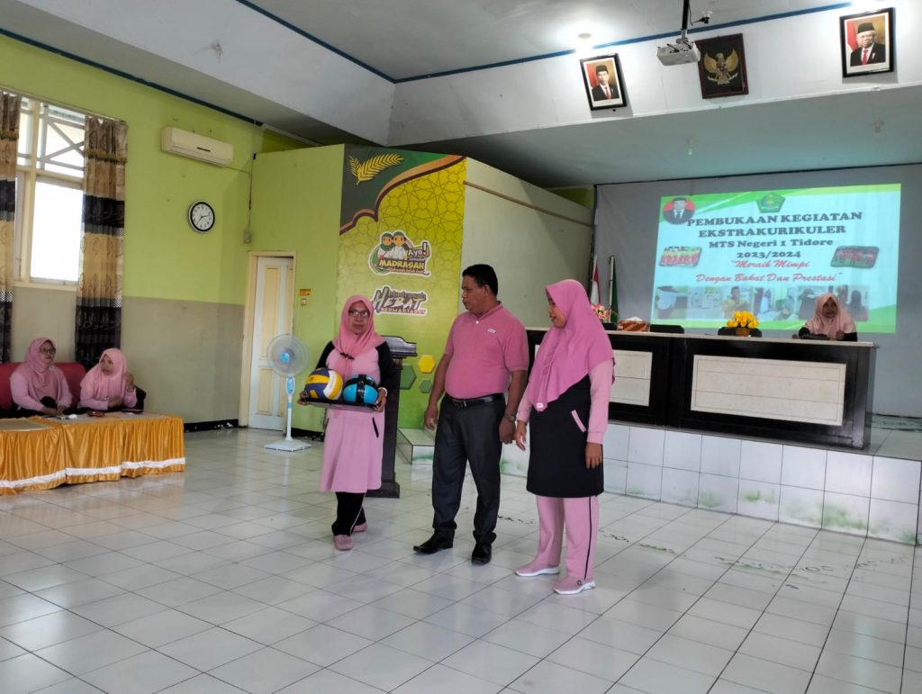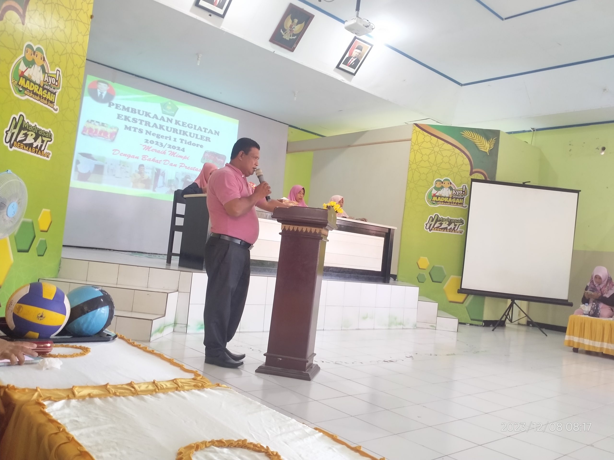 Jumat, 8 Desember 2023, Kegiatan Ekskul semester ganjil tahun Pelajaran 2023/2024 MTsN 1 Tidore dibuka secara resmi oleh Kepala Madrasah Bapak Lukman Djamal, S.Pd. Dalam sambutannya beliau menyampaikan bahwa tujuan Ekskul adalah untuk mengembangkan potensi, bakat, minat, kemampuan, kepribadian, kerjasama dan kemandirian peserta didik, adapun tema yang diusung kali ini adalah Meraih mimpi dengan bakat dan prestasi. Jenis kegiatan yang dilombakan antara lain dibidang seni dan olahraga. Panitia Ekskul terdiri dari ketua Fardia Muhammad, S.Ag, Sekretaris Darma Jafar, S.PdI dan Bendahara Jannah H Yahya, S.Ag